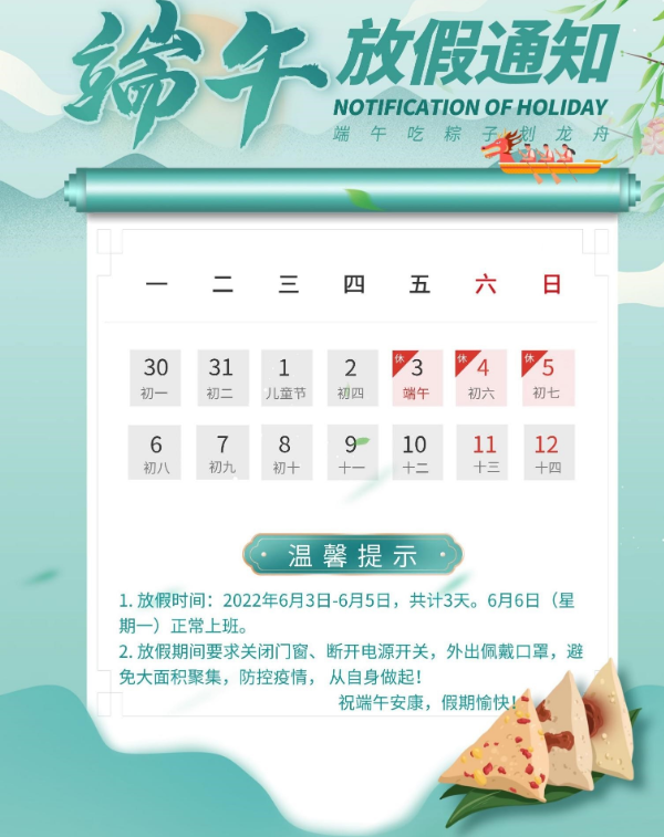 根據(jù)國務院辦公廳通知精神并結(jié)合公司實際,現(xiàn)將2022年端午節(jié)放假安排通知如下:6月3日(星期五)至6月5日(星期日)放假,共3天。請大家提前安排好工作生活,節(jié)日期間注意安全,減少人員聚集,加強個人防護,度過一個平安、祥和的節(jié)日假期。提前祝大家端午節(jié)安康!