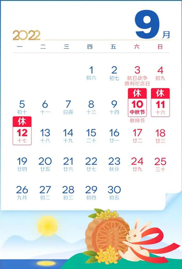根據(jù)《國務院辦公廳關于2022年部分節(jié)假日安排的通知》精神,2022年中秋節(jié)放假安排如下:9月10日至9月12日放假,共3天。